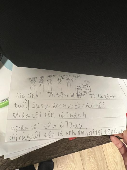ທ່ານນາງ ຫງວຽນທູ໋ຍ, ພໍ່ແມ່ຂອງນ້ອຍ Sam, ບໍ່ສາມາດປົກປິດຄວາມສຸກຂອງຕົນໄດ້ເມື່ອແບ່ງປັນຮູບຄອບຄົວທີ່ລູກຊາຍອາຍຸ 8 ປີແຕ້ມດ້ວຍມື, ພ້ອມກັບຄຳແນະນຳສັ້ນ ແຕ່ໜ້າຮັກເປັນພາສາຫວຽດນາມ: “ຂ້າພະເຈົ້າຊື່ Sam. ອາຍຸແປດປີ, Susu ແມ່ນໂຕແມວຂອງຂາ້ພະເຈົ້າ. ພໍ່ຂອງຂ້າພະເຈົ້າຊື່ ແທງ. ແມ່ຂອງຂ້າພະເຈົ້າຊື່ ທູ໋ຍ. ເອື້ອຍຂອງຂ້າພະເຈົ້າຊື່ ແອງ. ອ້າຍຂອງຂ້າພະເຈົ້າຊື່ ຫວຽດ.”