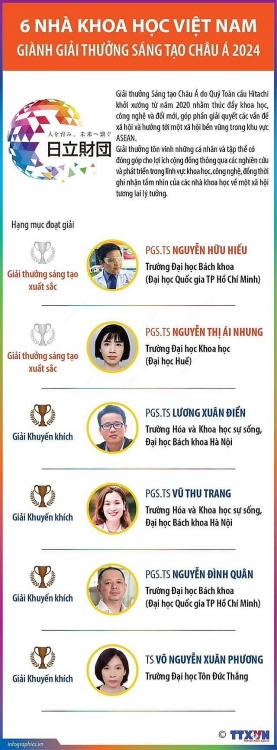 | ກອງທຶນ Hitachi ທົ່ວໂລກ ໄດ້ປະກາດລາຍຊື່ນັກວິທະຍາສາດ ອາຊຽນ ທີ່ໄດ້ຮັບລາງວັນປະດິດຄິດສ້າງ ອາຊີ 15 ຄົນ ປີ 2024. ໃນຈໍານວນນັກວິທະຍາສາດ 15 ທ່ານທີ່ໄດ້ຮັບລາງວັນ ມີນັກວິທະຍາສາດ ຫວຽດນາມ 6 ທ່ານ (ພາບ: ສໍານັກງານຂ່າວສານ ຫວຽດນາມ) |