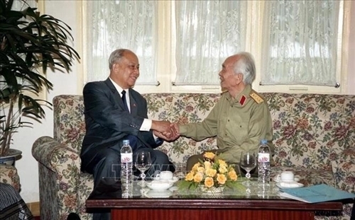 | ສະຫາຍ ຄໍາໄຕ ສີພັນດອນ ອະດີດປະທານພັກ, ອະດີດປະທານປະເທດລາວ ພົບປະກັບສະຫາຍພົນເອກ ຫວໍງວຽນຢາບ ໃນການຢ້ຽມຢາມຫວຽດນາມ ຢ່າງເປັນທາງການ (2002). ພາບເອກະສານ: ສໍານັກຂ່າວສານຫວຽດນາມ |